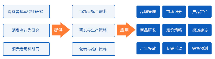 消費者研究是市場調(diào)研領(lǐng)域應用最多的消費品市場研究的一個最基礎(chǔ)、主要的組成部分,包括消費者基本特征研究、消費者行為研究、消費者動機研究三大部分。通過這三個層面的研究,為相關(guān)行業(yè)和企業(yè)提供:市場細分、產(chǎn)品定位、品牌管理、定價策略、新品開發(fā)、渠道建設(shè)、廣告投放、促銷活動、銷售預測等行為的理論、數(shù)據(jù)基礎(chǔ)。