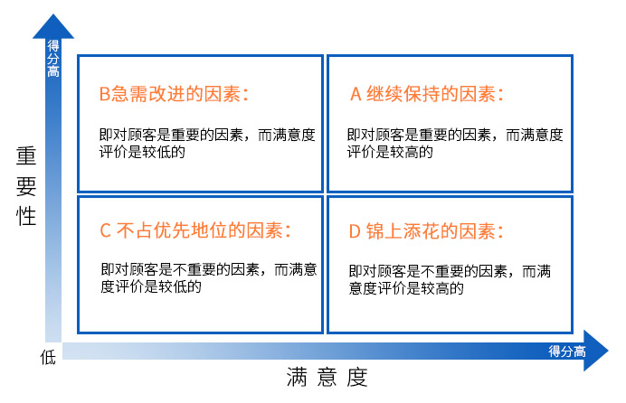 通過顧客對因素重要性的評價和滿意度評價,能夠區(qū)分出四種類型的因素,同時對企業(yè)或服務進行分析得出: